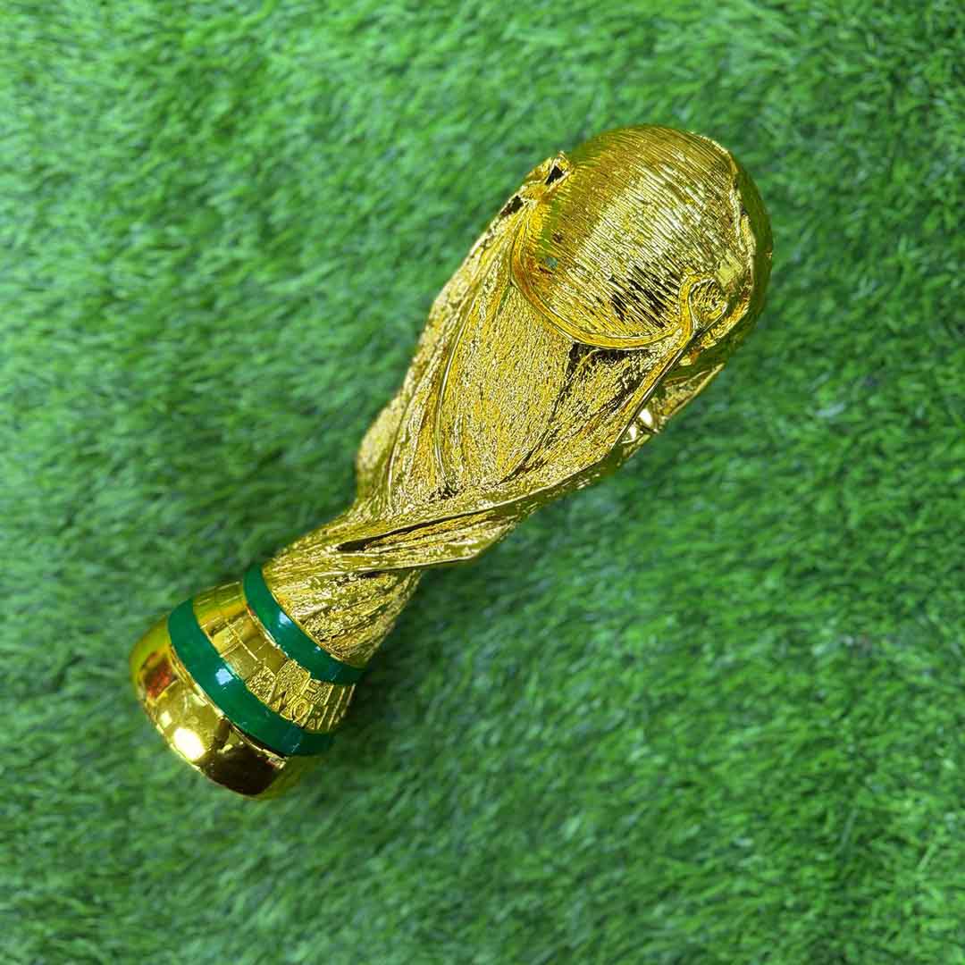 یک یادگاری خوشفرم و چشمنواز برای هواداران فوتبال: کاپ شبیه جام جهانی با ارتفاع دقیق ۱۳ سانتیمتر. این کاپ غیررسمی و فاقد هرگونه مجوز یا برند رسمی است — ساخته شده برای تزئین، اهداء در مسابقات محلی، مراسم تشویق تیمها و بهعنوان یادگاریای خاطرهانگیز.