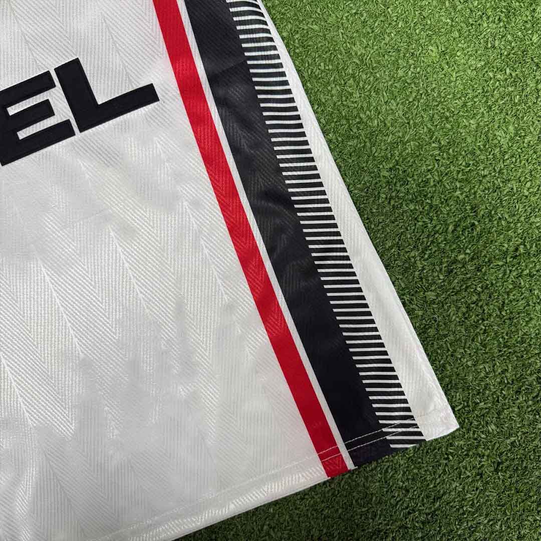 این لباس تاریخی با طراحی سفید و جزئیات قرمز و مشکی، یادآور دوران طلایی بازیکنانی مثل مالدینی، بوبان و وِآست.
