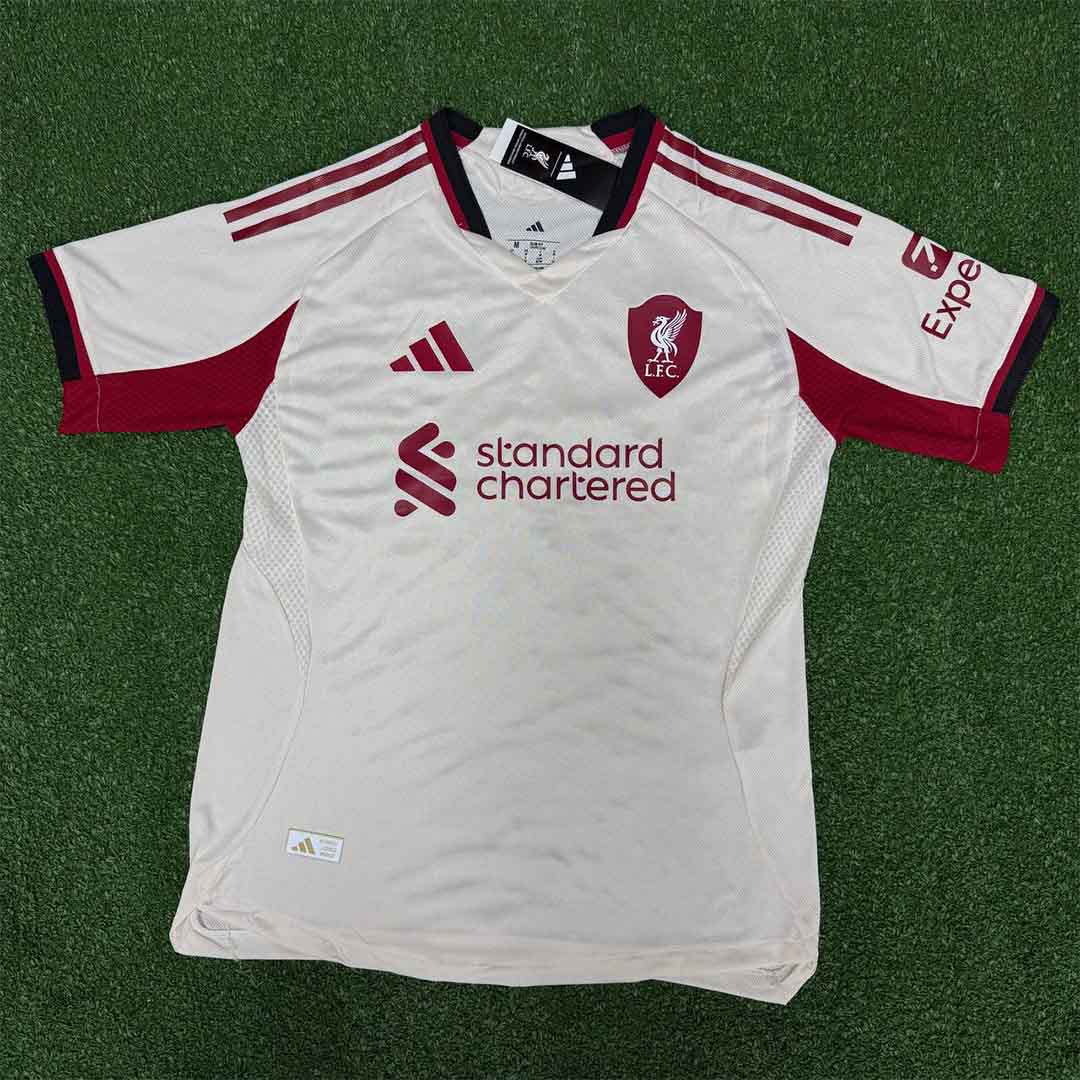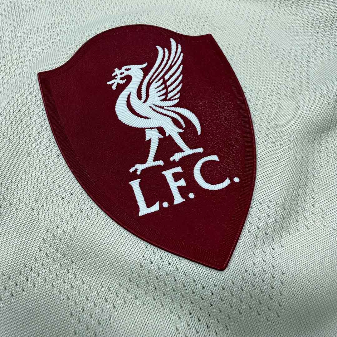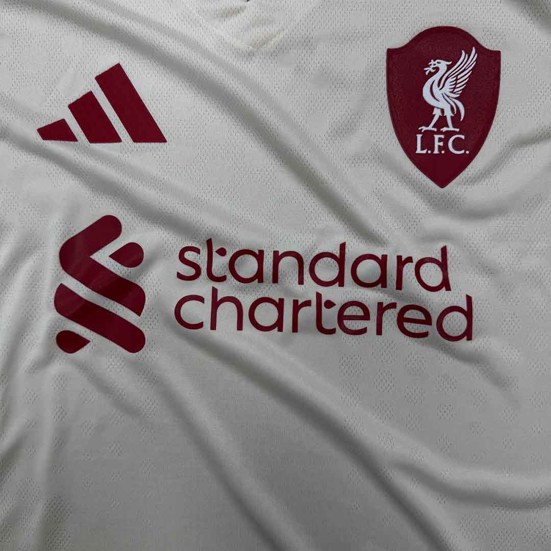 کیت دوم لیورپول 2025-2026 از زمینه با طیف رنگ کرم و سفید طراحی شده است. جزئیات این کیت از رنگ قرمز و زغالی تشکیل شده است. نوار سه خط آدیداس با طیف رنگ قرمز روی شانه لباس وجود دارد و سرآستین نیز از ترکیب خطوط زغالی و قرمز است. در قسمت روی سینه لباس نیز نماد آدیداس و لوگو لیورپول در یک سپر محافظتی و با رنگ قرمز وجود دارد. سپر دور لوگو لیورپول نمادی به عنوان جنگندگی و حفاظت از اسم و لوگو باشگاه لیورپول است.