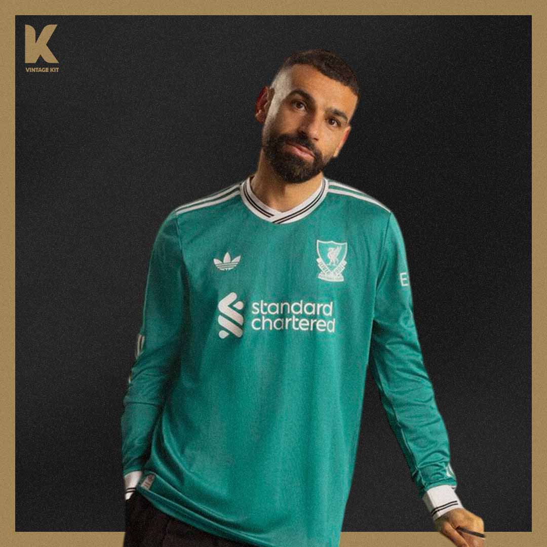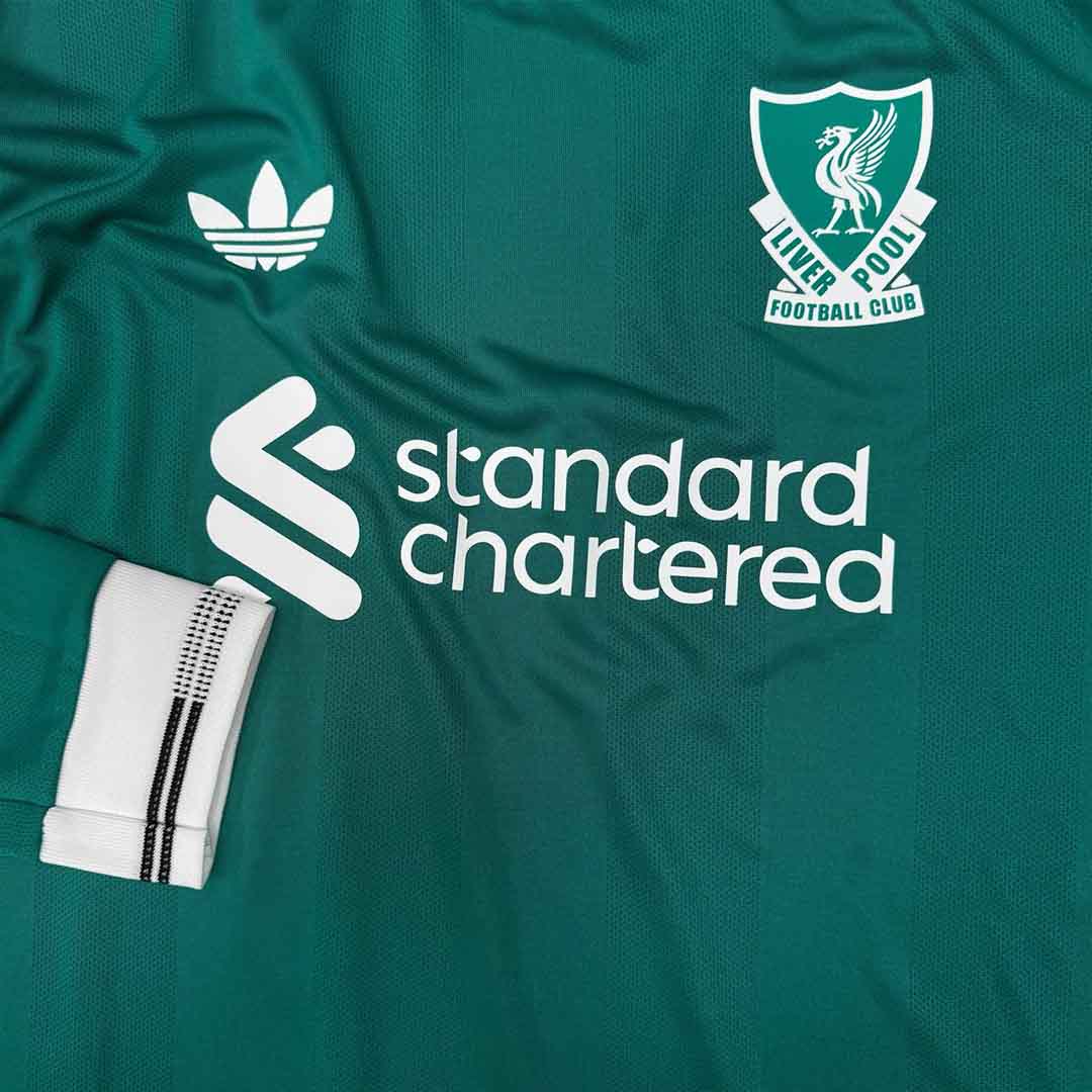 کیت سوم لیورپول 2025-2026 (آستین بلند) توسط برند آدیداس و در زمینه رنگ جذاب سبز دریایی رونمایی شده است. طراحی این لباس با خطوط راه راه شکل گرفته است. همچنین این لباس به مخاطب، حس نوستالژیک منتقل میکند. در قسمت روی سینه لباس نیز لوگو قدیمی لیورپول و آدیداس نقش بسته است. در نقش مکمل، سهخطِ آدیداس، یقه و آستین با ترکیب رنگ سفید و مشکی جلوهٔ ویژهای به کیت بخشیدهاند.