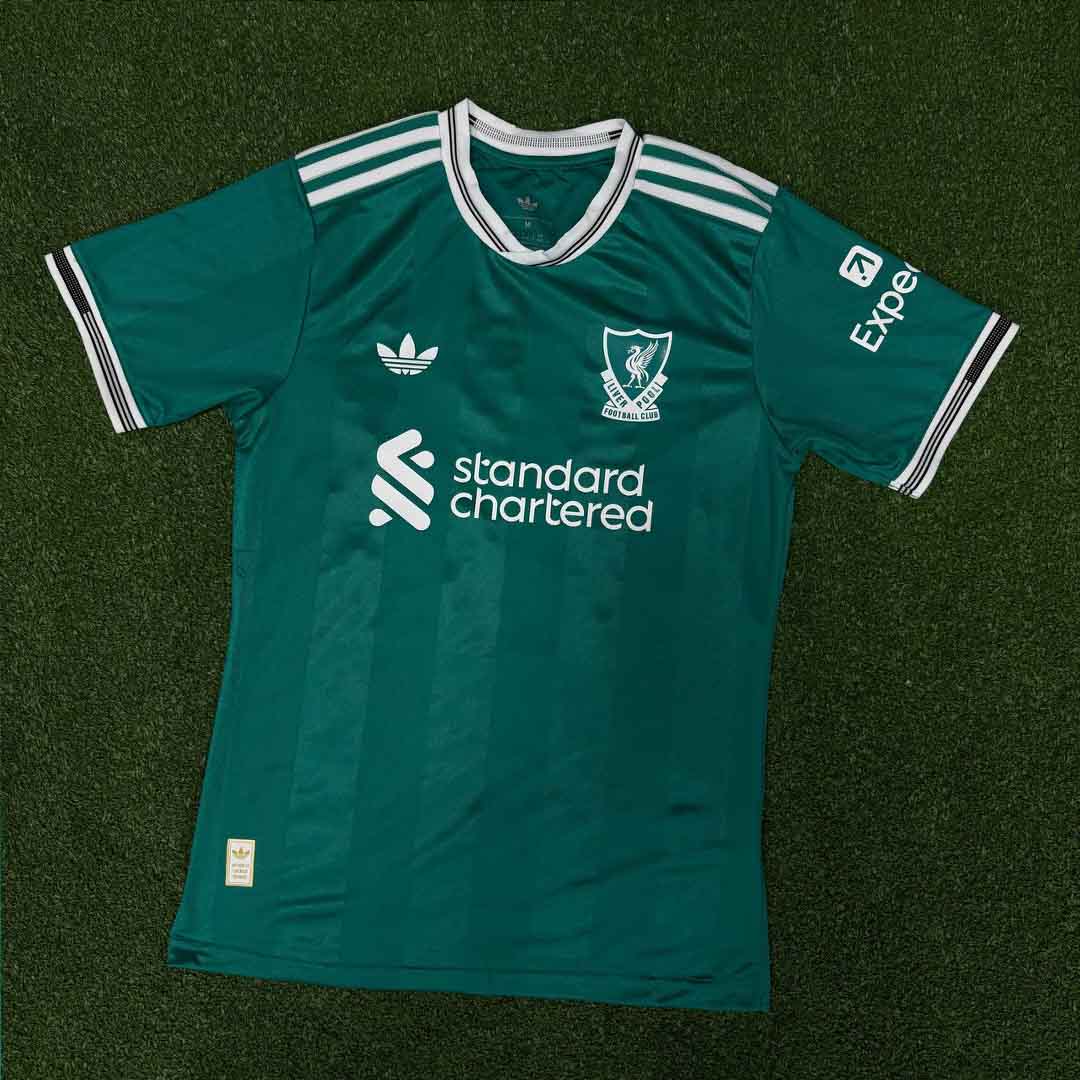 کیت سوم لیورپول 2025-2026 توسط برند آدیداس و در زمینه رنگ جذاب سبز دریایی رونمایی شده است. طراحی این لباس با خطوط راه راه شکل گرفته است. همچنین این لباس به مخاطب، حس نوستالژیک منتقل میکند. در قسمت روی سینه لباس نیز لوگو قدیمی لیورپول و آدیداس نقش بسته است. در نقش مکمل، سهخطِ آدیداس، یقه و آستین با ترکیب رنگ سفید و مشکی جلوهٔ ویژهای به کیت بخشیدهاند.