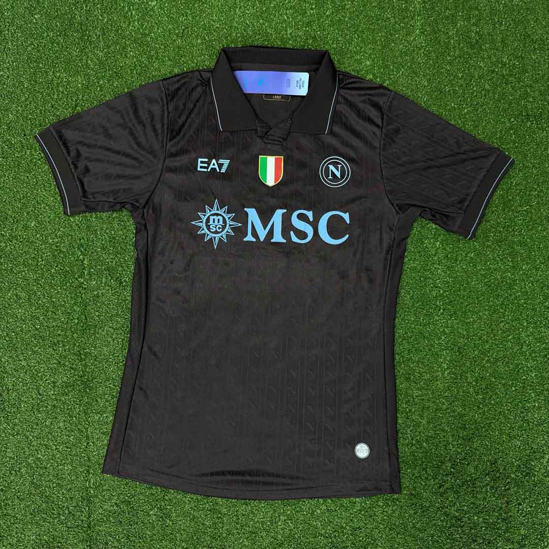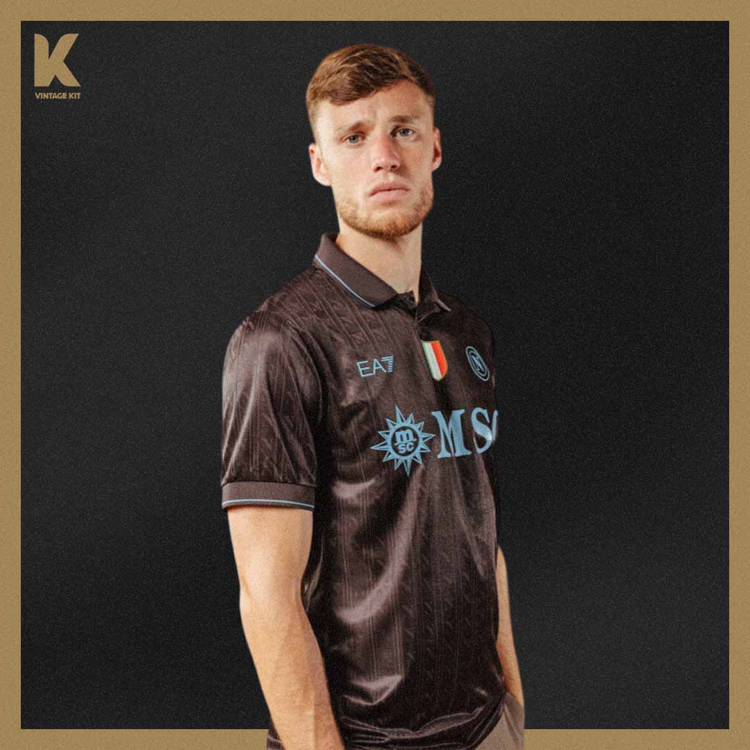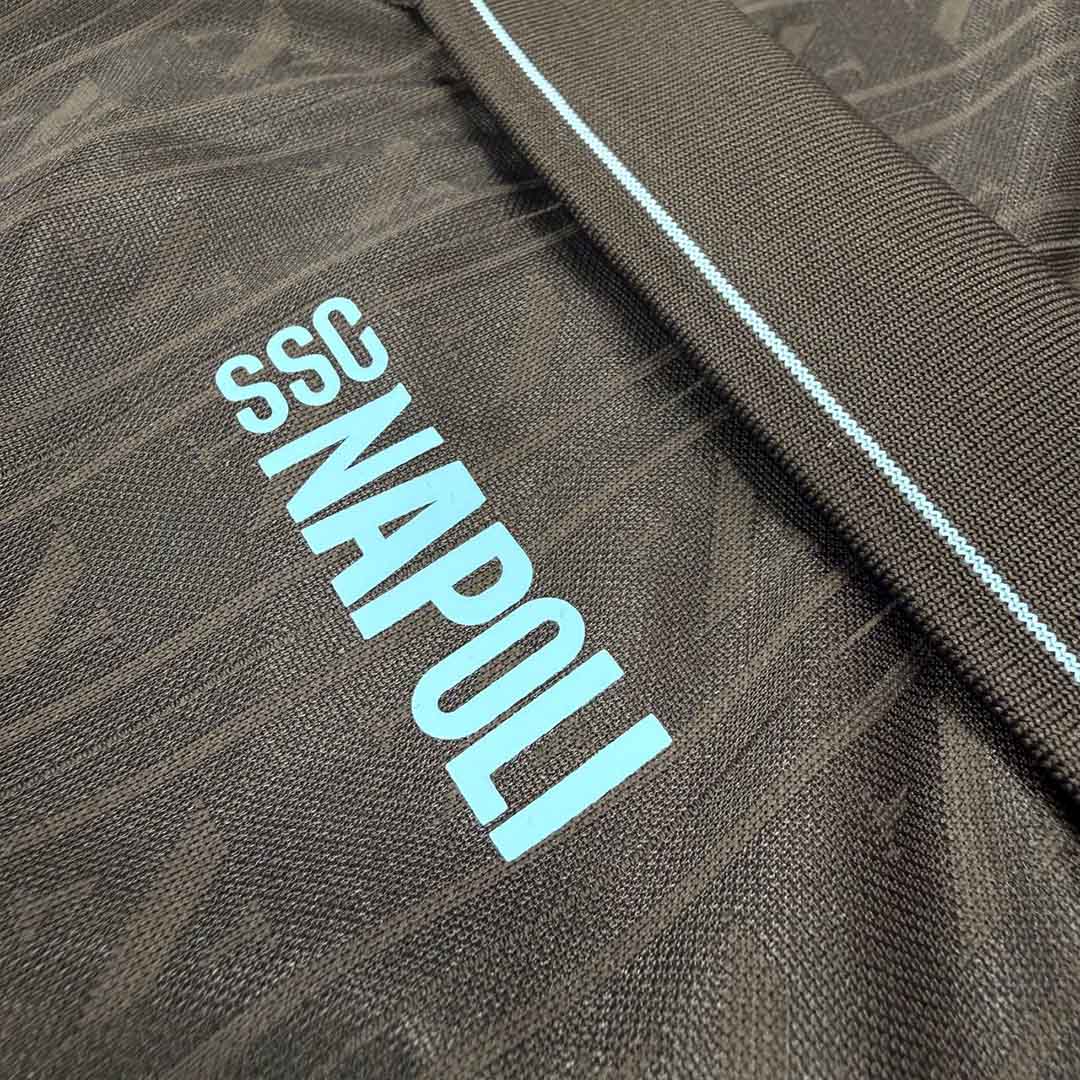 کیت سوم ناپولی 2025-2026 ، با نام «Café»، بهعنوان یک ادای احترام به فرهنگ قهوهنوشی ناپلیها طراحی شده است. این پیراهن با رنگ قهوهای غنی، الگوی بافتی ظریف از حرف «N» باشگاه، یقه پولو با لبههای آبی روشن، و لوگوهای EA7 و MSC به رنگ آبی روشن، ترکیبی از اصالت و مدرنیته را ارائه میدهد. در پشت یقه عبارت «SSC Napoli» به رنگ آبی درج شده است.